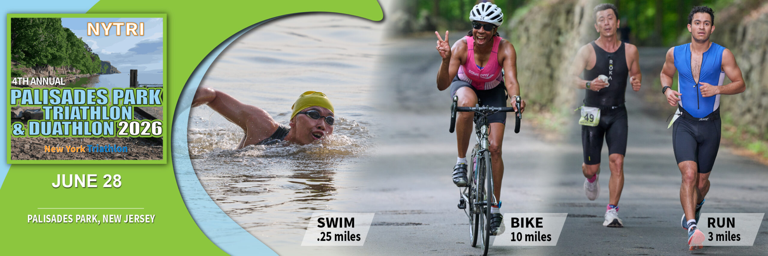 The 4th Annual Palisades Park Triathlon is back! We are extremely excited to host this epic triathlon in beautiful Palisades Park in New Jersey! This is our 4th year running this race. With a gorgeous view of the Hudson River, and the rolling hills of Henry Hudson Dr, it makes for a very challenging and rewarding course in each discipline. As this is an open water event in the Hudson River, the swim can sometimes be challenging and the water temperature may not be super warm in June. Wet suits are allowed but not required. Life guards will be on duty to ensure a safe and successful swim for all triathletes.